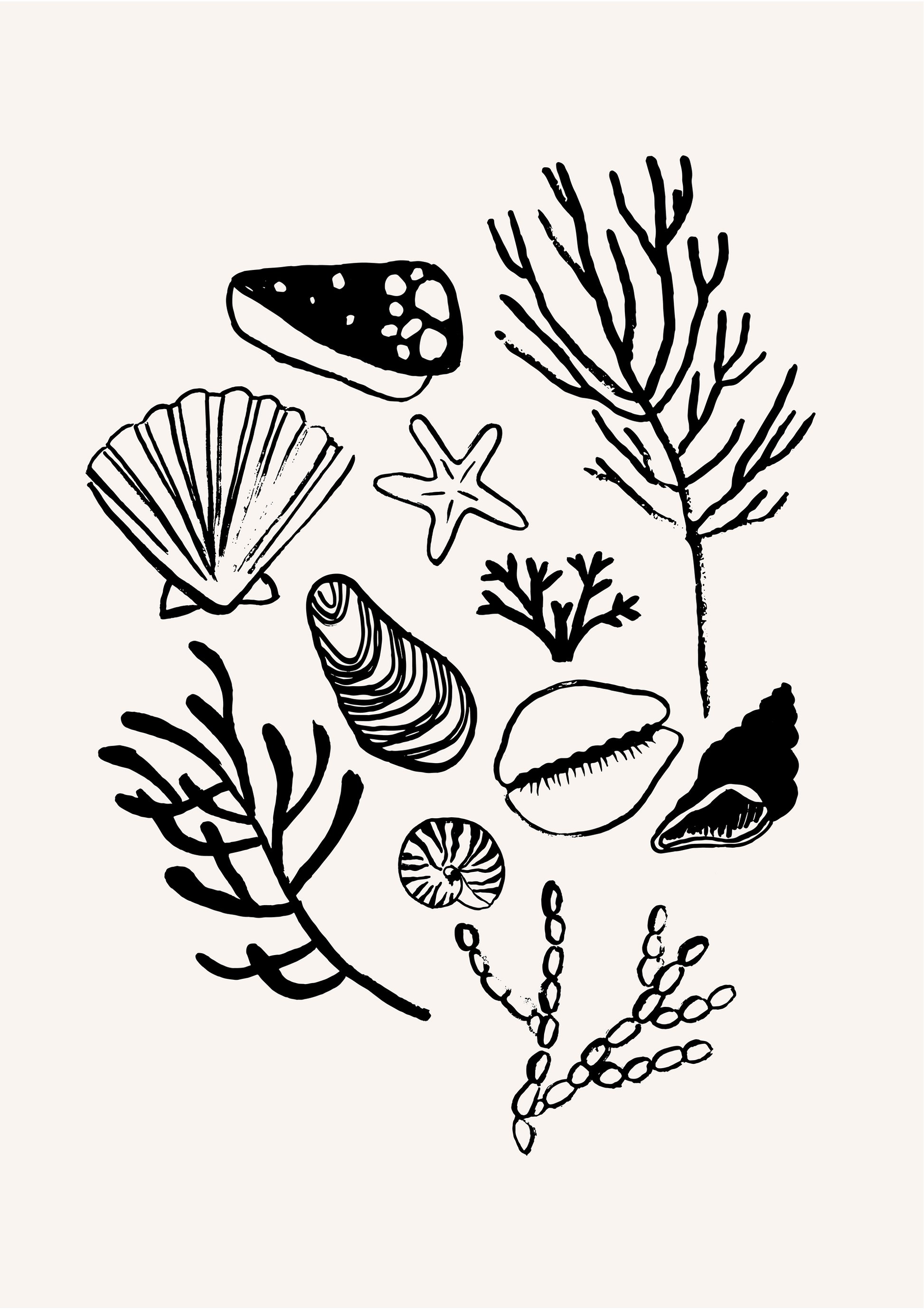 Looking for shells on the beach is the ultimate treasure hunt and is what inspired this design. I love looking for shells, and ever since our daughter could walk, we’d hold hands, walk along the beach, and look for shells. We would have buckets of shells at home that we’d found at the beach. It’s something I see so many families do, and I hope as they look at these shell prints on their wall, they think about those peaceful moments on the beach looking for shells.
